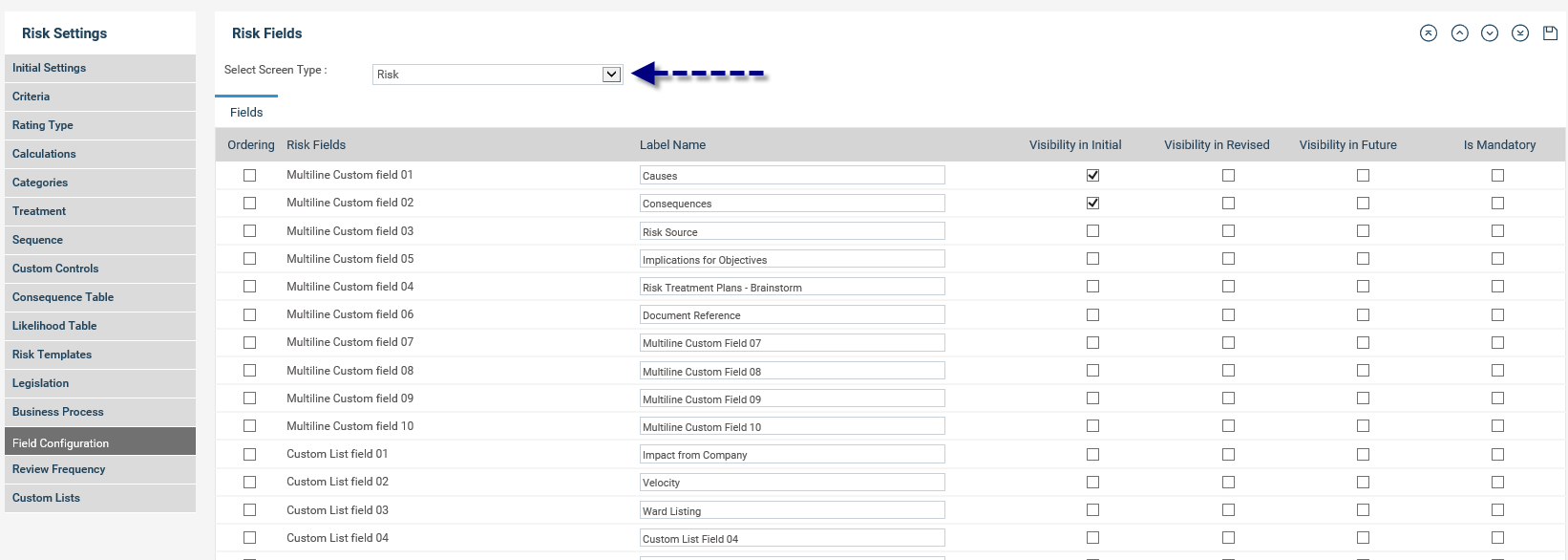 STEP 1: Click on the Field Configuration tab. Select your screen type (defaults to Risk, however you can also configure the Risk Control fields within this area).
