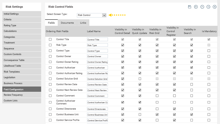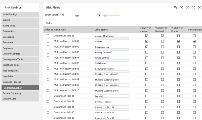 STEP 1: Click on the Field Configuration tab. Select your screen type (defaults to Risk, however you can also configure the Risk Control fields within this area).