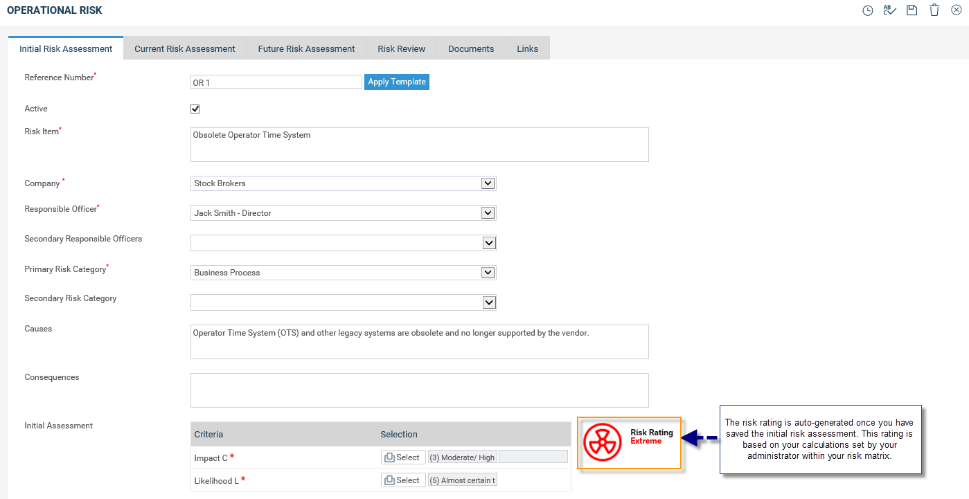The screen will refresh and the new risk template will be displayed for you to start entering the details to the first Initial Risk Assessment tab.