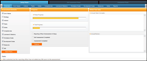 '360' involves a 360 assessment on selected Competencies. This means that staff members, other than the Reporting Officer, get to evaluate the Assessee performance. An average of all the ratings obtained from the 360 Participants is calculated to produce a '360 rating'. The reporting officer selects these within the endorsement phase.