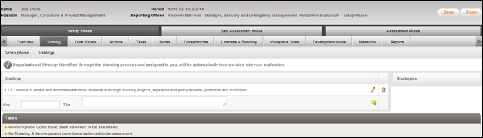 This encompasses key organisational strategies identified through the planning process and assigned to the Assessee. These can also be automatically incorporated into the performance assessment for the review process