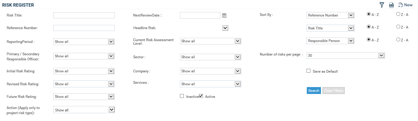 Text box that allows you to type in the Risk title and search for the Risk. This is a key word search and therefore, by entering a part of the title you will be able to filter out all risks that contain the typed characters anywhere in the title. |