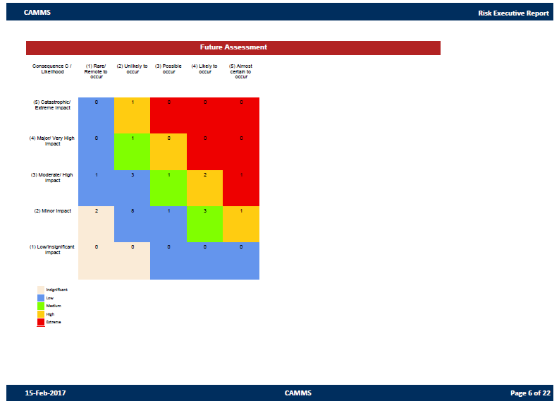 Displays a heat map for Initial, Current and Future Assessment for all risks. It will show the number of risks which fall into the specific risk rating areas of the heat map based on their likelihood and consequence calculation. |