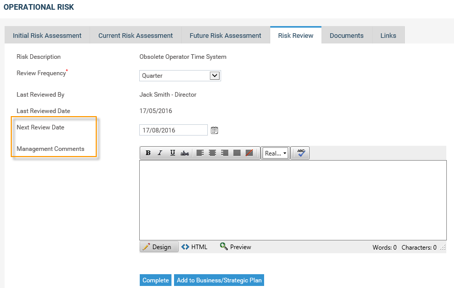 The Next Review Date will automatically pick up the next available date as per your specified frequency when it is next reviewed. However, you can modify the date using the calendar control.