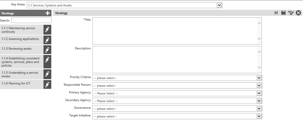 Select one of the pre-defined ‘PRIORITIES’ from the drop down list. This must be completed for the ‘Priorities and Agencies’ Strategic Plan report to contain information in the relevant fields. |