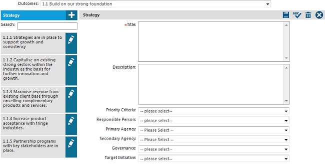 Select agencies from the list. At least one ‘AGENCY’ must be nominated in order for this strategy to appear in the ‘Priorities and Agencies’ Strategic Plan Report. That agency may be the Organisation itself. |