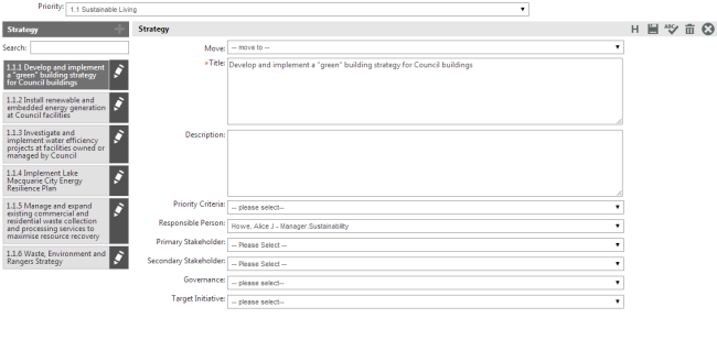 Select one of the pre-defined ‘STAFF’ from the drop down list. If a new person is required, they must be entered into the Staff section. The allocation of one strategy to one person will ensure clarity of purpose within the organisation. |